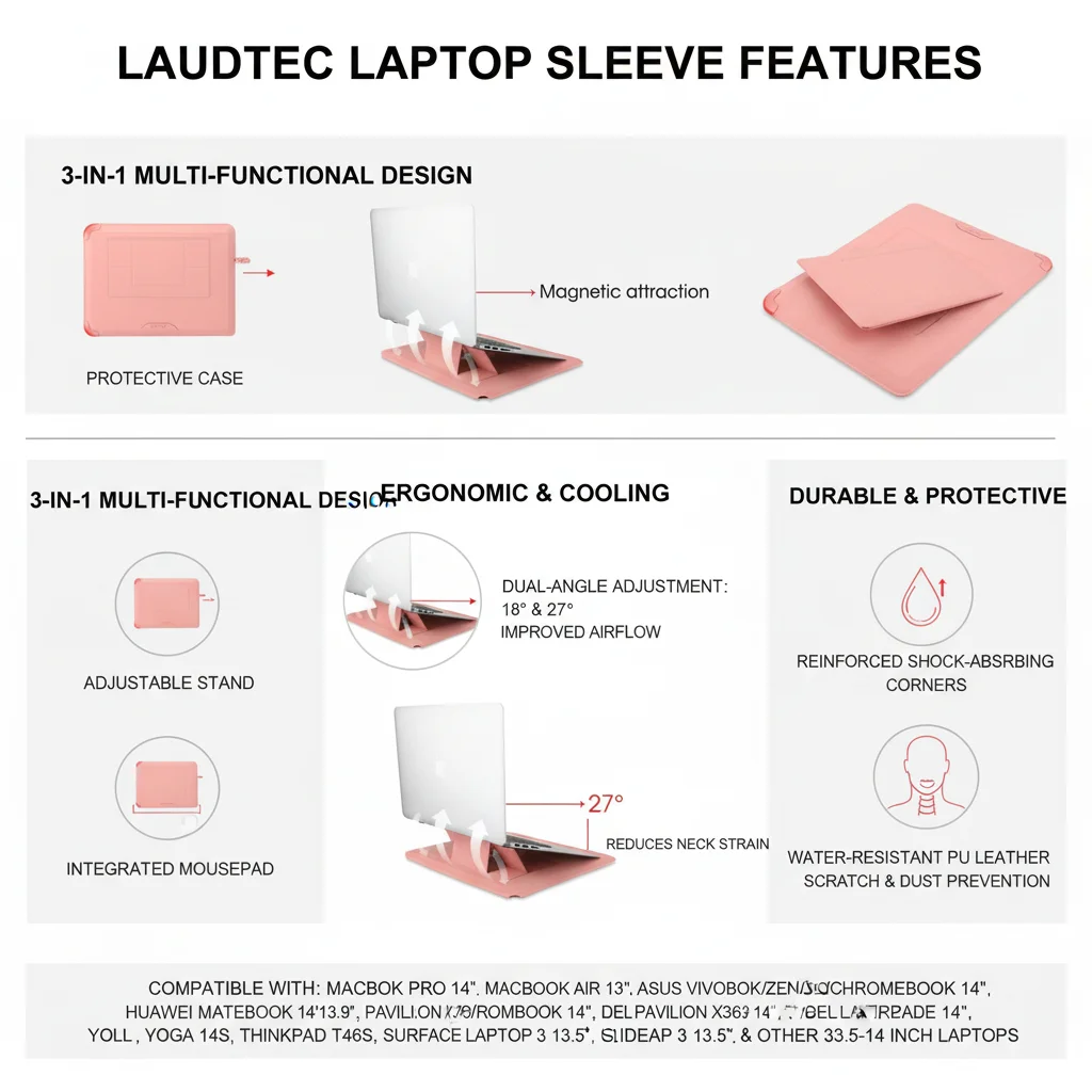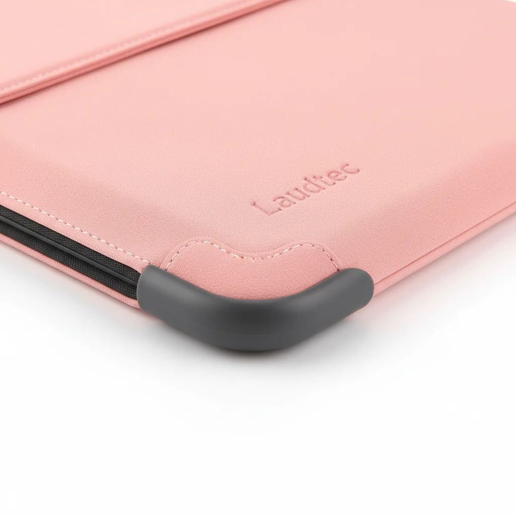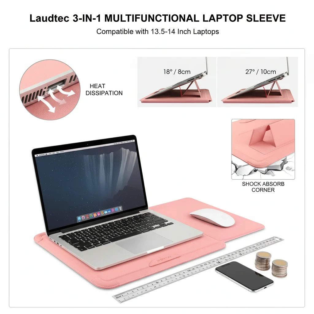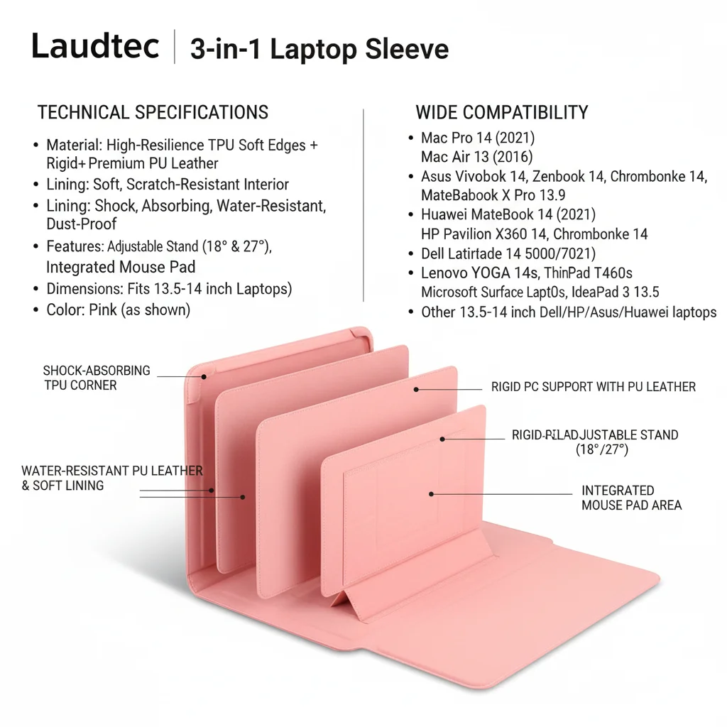 Funda para portátil al por mayor de fábrica, alta calidad, OEM/ODM, funda de cuero PU con ángulo ajustable y soporte, 14'', color rosa