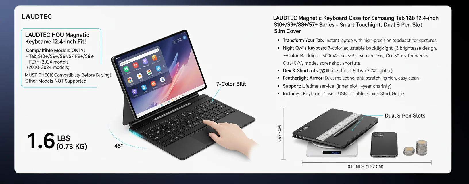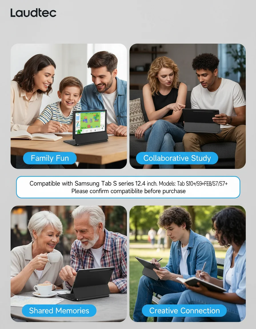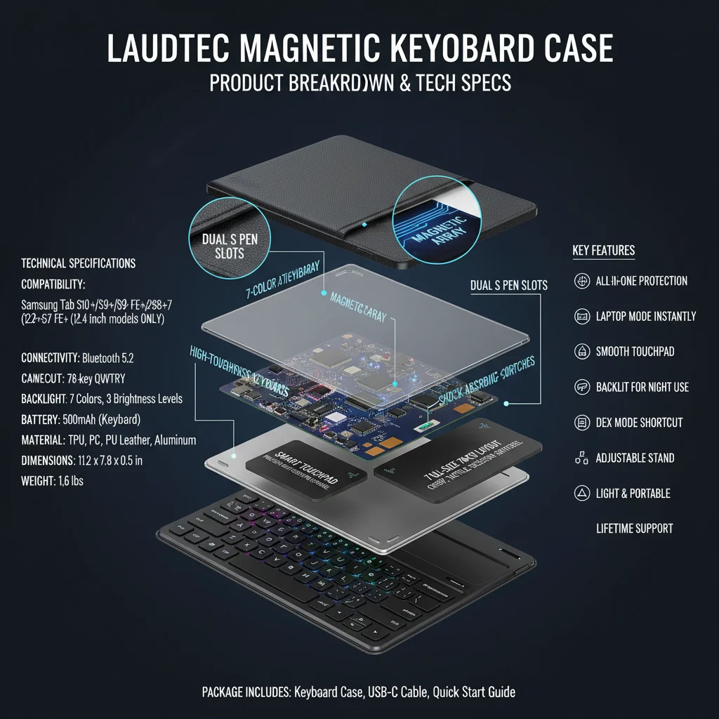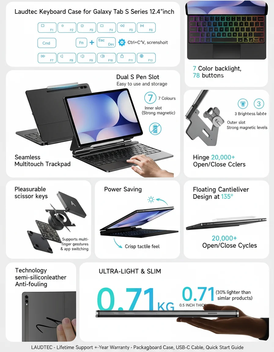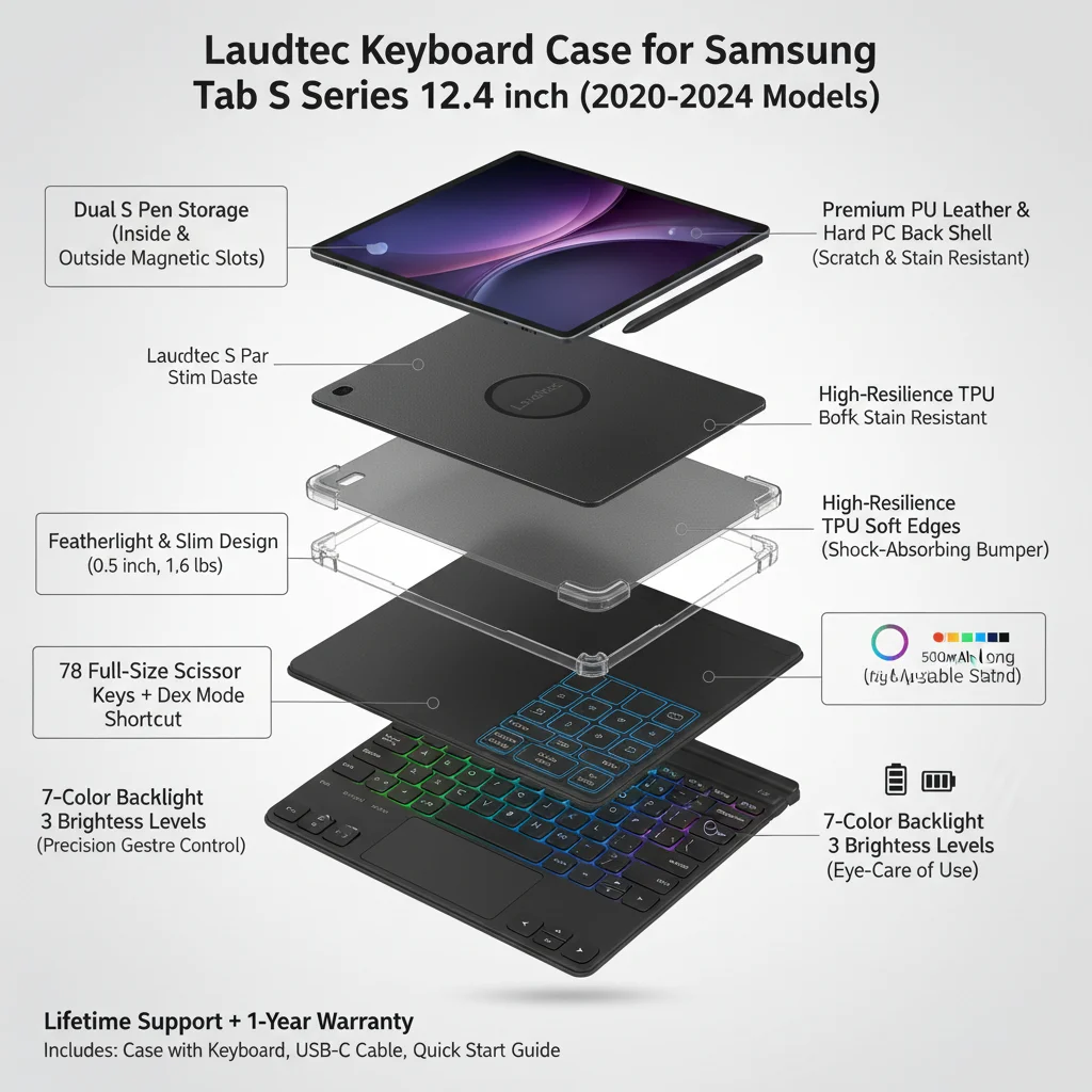 12.4インチキーボードケース(Samsung Galaxy Tab S10/S9/S9 FE/S8/S7対応)、トラックパッド搭載、バックライト付き、Sペンホルダー付、マグネット式スタンド、軽量設計、Laudtec製