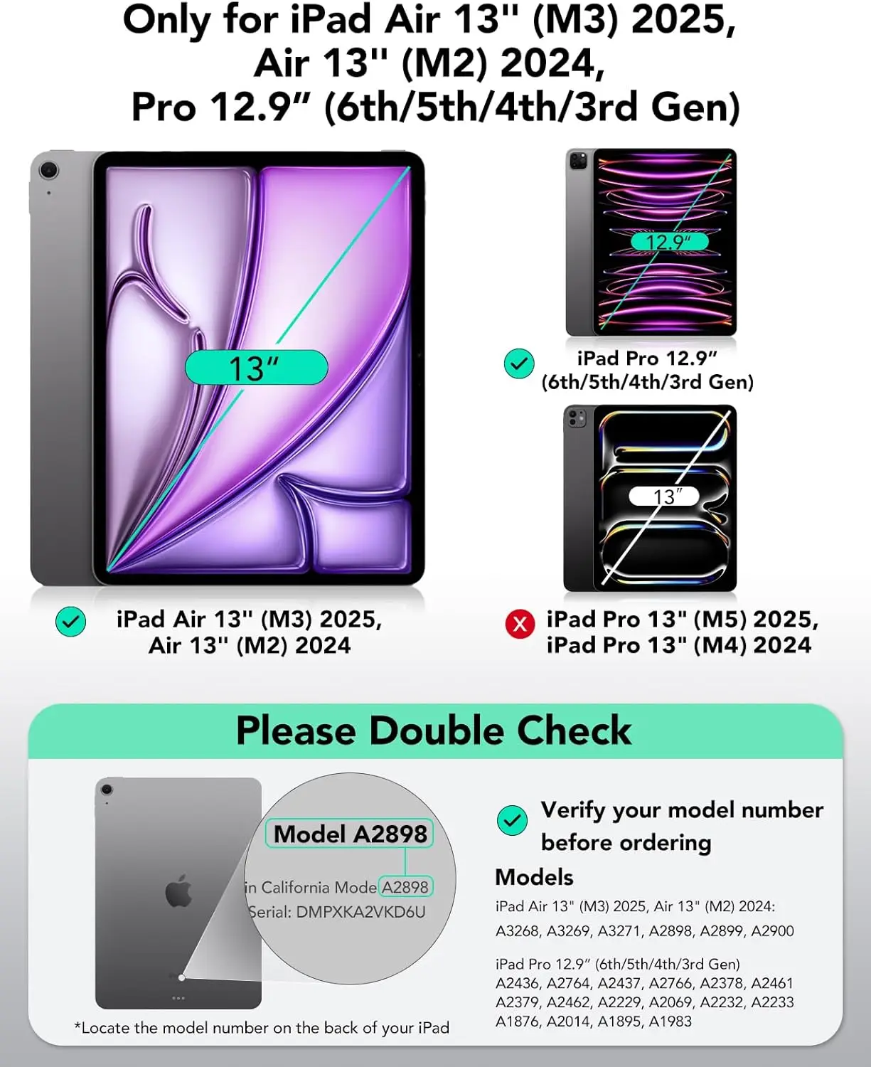 * Compatibility: only compatible with iPad Air 13(M3/M2 2025/2024), iPad Pro 12.9 inch (6th/5th/5th/3rd); models A2898、A2899、A2900、A3268、A3269、A3271、A2436、A2437、A2764、A2766、A2378、A2461、A2379、A2462、A2229、A2069、A2232、A2233、A1876、A2014、A1895、A1983