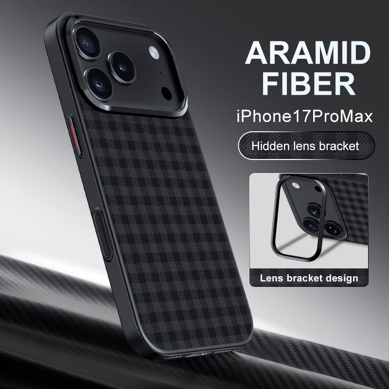 product ultra slim genuine aramid fiber magnetic shockproof hard cover for iphone 17 pro max metal camera lens stand mobile phone case-22
